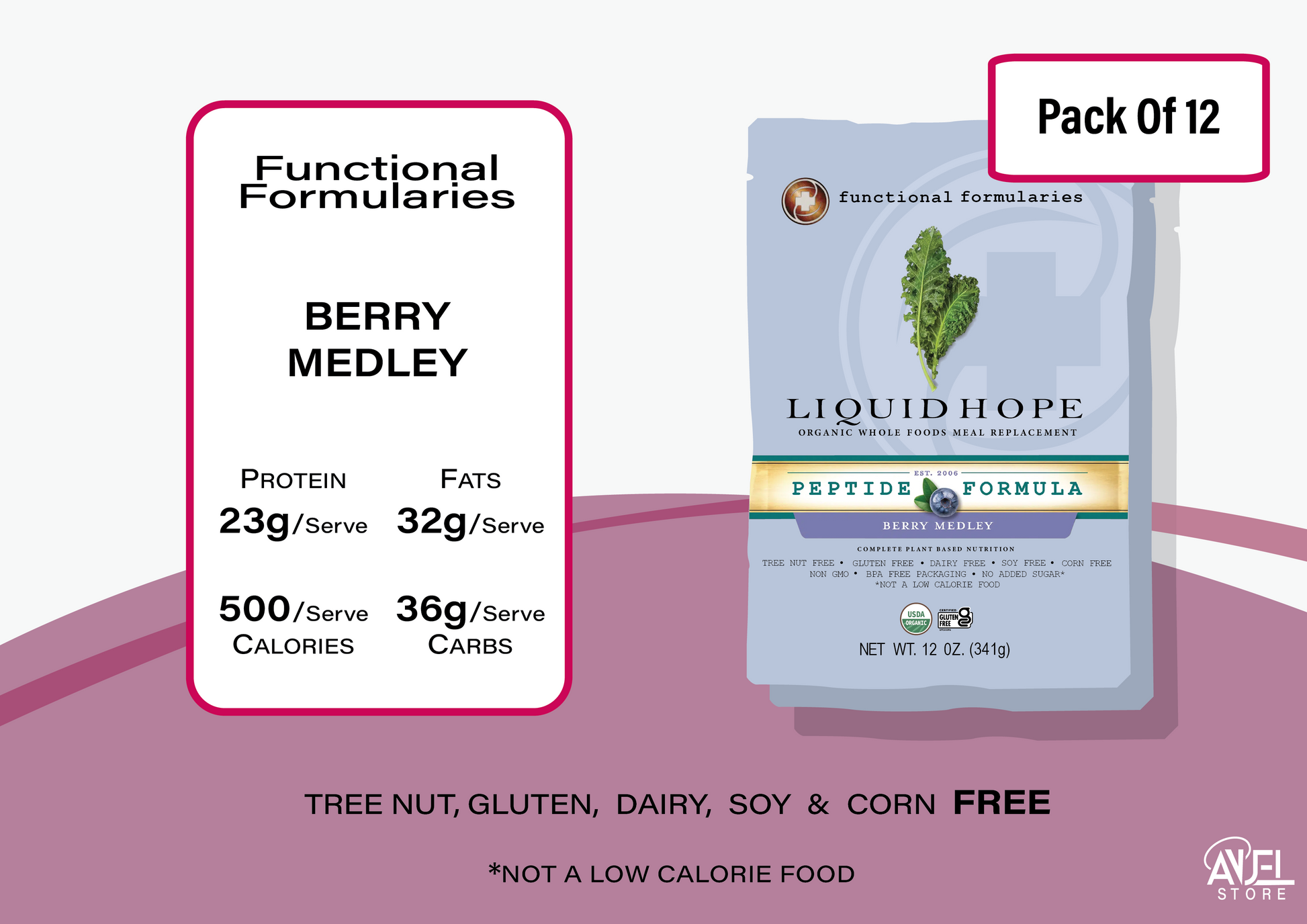 Liquid Hope Peptide Berry Medley contains 2 full servings* of fruit & vegetables, over 100 berries**, and 23g of complete protein per pouch with hydrolyzed pea protein for enhanced digestion and maximum nourishment. Formulated with functional ingredients for optimal digestion and gut health including organic apple cider vinegar, cinnamon, cranberries, blueberries, and pumpkin. Designed for adults using feeding tubes. Also perfect for tube transition and oral use – delicious as a smoothie or by the spoonful!